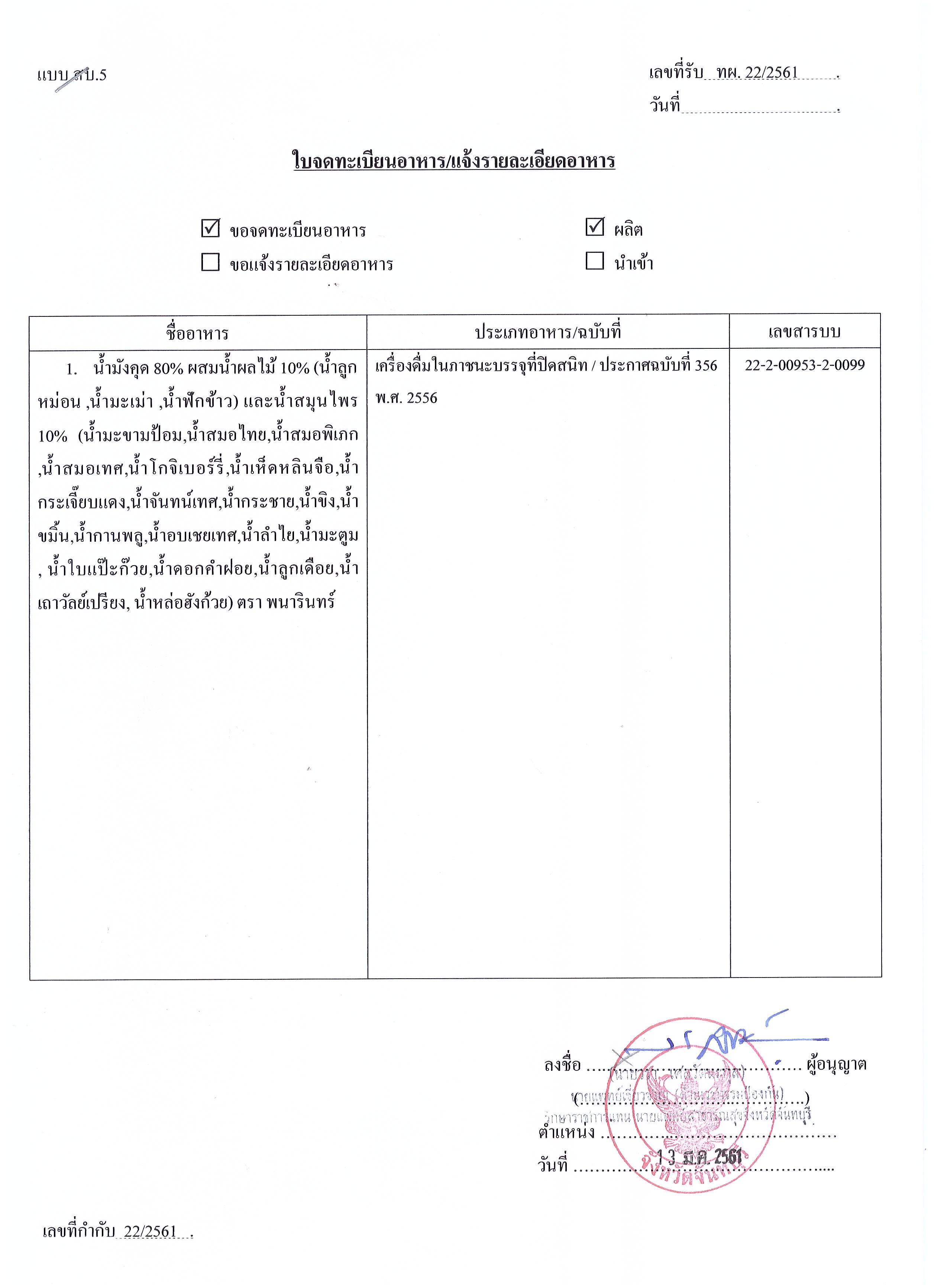 น้ำมังคุดทิพย์มงคล ผสมน้ำผลไม้และสมุนไพร 24 ชนิด ตราพนารินทร์ เลขที่ อย. 22-2-00953-2-0099 ผลิตโดยโรงงานมาตรฐาน GMP/HACCP น้ำมังคุดทิพย์มงคล ตรา "พนารินทร์" รสชาติแห่งน้ำมังคุดแท้ ชนิดเข้มข้น จากจันทบุรี ผสมผสานน้ำผลไม้และสมุนไพรอย่างลงตัว 24 ชนิดน้ำมังคุดทิพย์มงคลตราพนารินทร์ ผลิตจากเนื้อมังคุดจากธรรมชาติแท้ๆ และเพื่อรสชาติและคุณประโยชน์ที่ยิ่งขึ้นไปอีกจึงได้ผสมผสานน้ำผลไม้และสมุนไพรในปริมาณที่พอเหมาะดังนี้ ส่วนประกอบ Ingredients